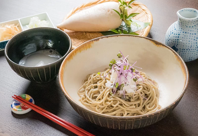 週末與假日,則能品嚐以富山清澈水源孕育的「八尾在來種」製作的石臼現磨、純手工蕎麥麵。以蕎麥粉製作的甜點,香氣濃郁卻低卡無負擔,是深受喜愛的選項。「盛蕎麥」與「熱蕎麥」不僅在週末供應,平日亦可享用,為蕎麥迷帶來滿滿幸福感。