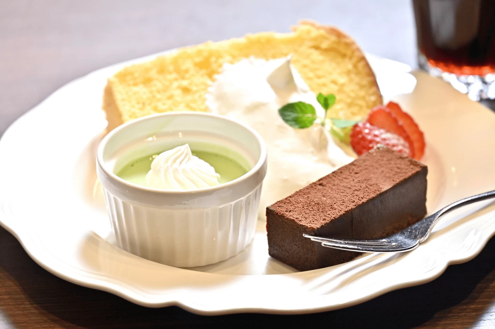 甜點選項多樣,包括蛋糕、手工鬆餅、聖代等,其中最受歡迎的莫過於「主廚精選甜點三重奏」。將當日推薦的甜點精緻地組合在一盤上,外觀繽紛華麗、份量恰到好處。由於內容每天都不同,每次造訪都能邂逅新口味。