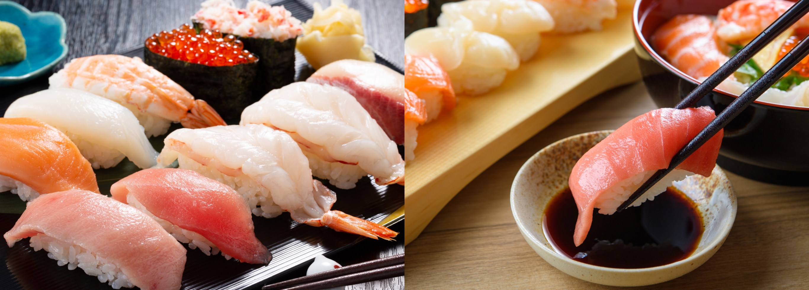 壽司的基本禮儀是只將醬油沾在魚料上。若醬油碰到醋飯,會讓握壽司散開,變得難以食用。軍艦卷則建議用薑片沾醬油後塗抹在食材上,這是一種內行人的技巧。若不喜歡芥末,可以提前告知「請做不加芥末(さび抜き)」,就能安心享用。