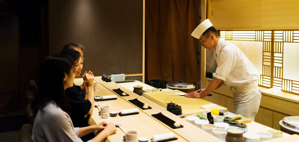 推薦給希望靜靜享用壽司的少人數聚會、商務接待或紀念日場合。與師傅面對面,一邊聊天一邊享用,或者從展示櫃中選魚料現場握壽司,都是極具壽司文化氣氛的體驗。與板前師傅互動也是吧台座席的特權之一。
