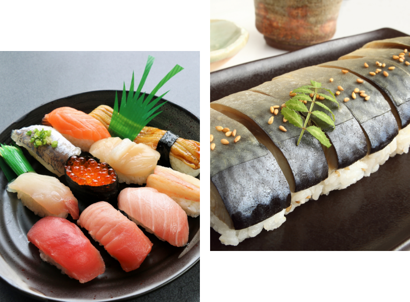 壽司的代表性食材有大腹、中腹鮪魚,還有油脂豐富的鮭魚也深受喜愛。其他像是比目魚、鯛魚、赤貝、北寄貝、鮭魚卵、海膽等,每樣都讓人垂涎。據說即使是同樣的食材,不同板前師傅的處理方式也會帶來不同風味,因此尋覓自己喜愛的味道而巡訪壽司店也是一種樂趣。
