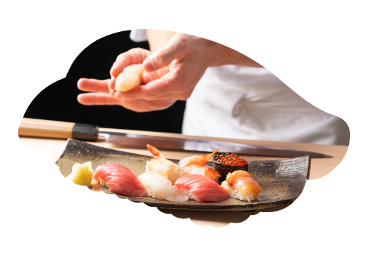 以純正江戶前壽司店以紅醋握飯為主打,其食材的優質源自於與供應商漁夫建立的信任關係。套餐「小菜及握壽司的廚師推薦」需提前預約,能根據季節和魚的狀態提供當天最美味的食用方式。透過故意進行食材的陳化等細緻的堅持,最大程度地激發食材的魅力。套餐通常包含約8種小菜和約10貫握壽司,可享受長達2至3小時的奢華時光。亦可在小菜後根據個人喜好獲得握壽司。在精緻的環境中,盡情享受壽司直至心滿意足。