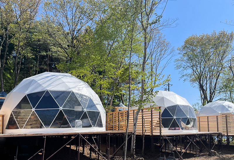 2023年,宮城縣氣仙沼大島新開幕的高台設施,可以邊眺望海洋和山脈,度過舒適的時光。在被大自然包圍的絕佳地點中,可以享受豪華露營和露營。豪華露營區設有3座圓頂帳篷,每座皆配備衛浴棟(洗手間、浴室、廁所)。擁有主題的內裝療癒身心,且豐富的女性友善備品令人滿意。露營地也已整備完善,從初學者到資深者都能廣泛利用。邊眺望海景的燒烤是特別的體驗,尤其夕暮時分的美麗景色絕對不可錯過。