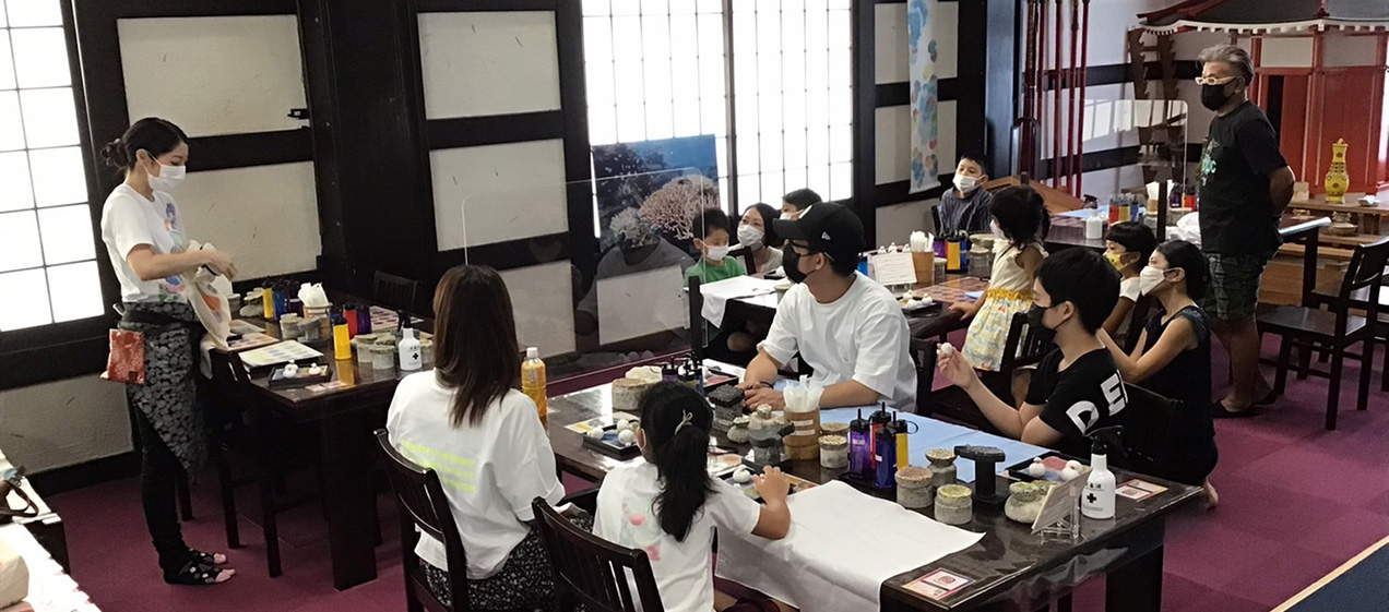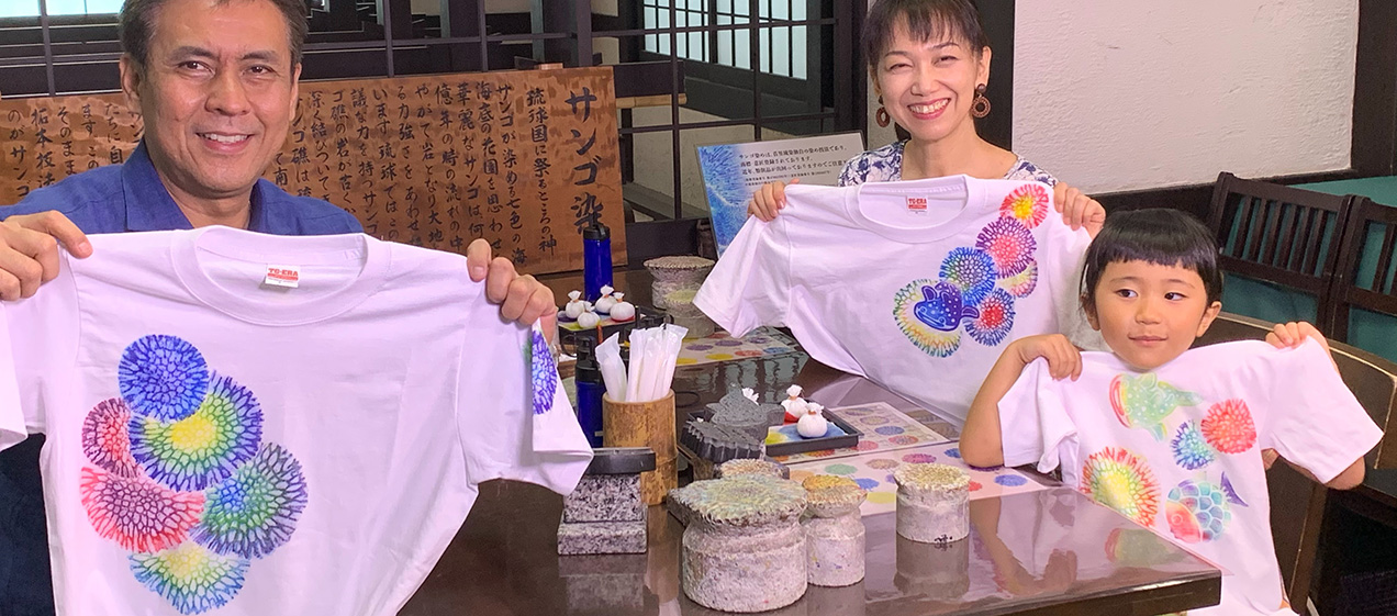 沖繩旅行的回憶及原創伴手禮製作都非常適合的「珊瑚染體驗」。利用各種大小不一的珊瑚化石和色彩繽紛的染液,可以製作出色彩豐富且獨特的圖案。試著做一件帶有自己獨特巧思的作品吧。
