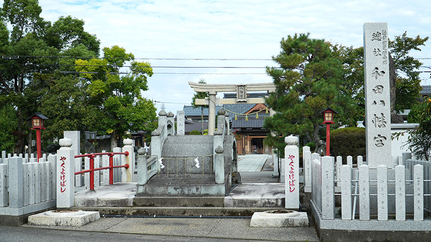 位於福井市東部地區的八幡宮。據傳由源滿仲於959年(天德3年)創建。祭祀神為應神天皇、仲哀天皇、神功皇后三位家族神。境內社有毘沙門社、稻荷社、日吉社、弁天社,全年各種祭典熱鬧非凡。看點多樣,其中本殿正面的「藥醫門」不可錯過,可見鎌倉時代的建築風格,原為神官住宅入口之用。此外,在「塔之池 弁財天 錢洗之池」可淨化金錢,祈求財運等。
