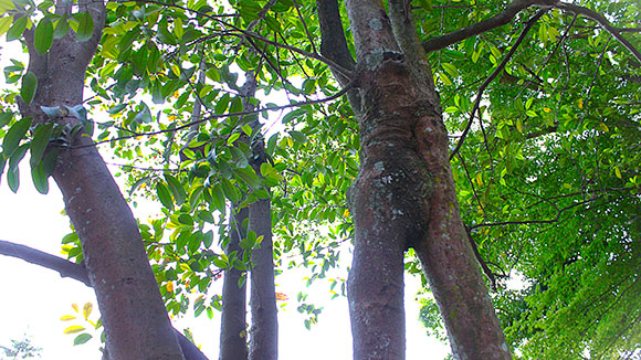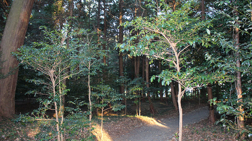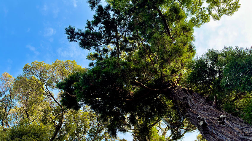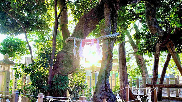 曾有一次雷擊,樹幹中心被燒毀只剩表皮,但這棵靈木‧樫木仍然存活並繼續生長。據說它具有延年益壽、回歸原點的力量,且通過其中空洞的地方可帶來受孕的福德。神道信仰中,有我們在日常生活中重生的觀念。若能獲得神恩回歸原點,便能珍惜身邊有緣之人。
