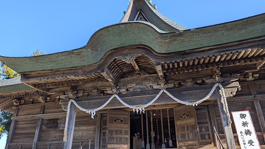 社殿於1710年(寶永7年)遷座至現在位置,由莊內藩主酒井氏捐贈創建,展現傳統風格的神社建築。拝殿幾乎保持當時原貌,為切妻造平入銅板屋頂,附有千鳥破風,設有唐破風的向拝,營造出安穩參拜的空間。位於拝殿後方的本殿是重建的建築,流造優美的曲線彷彿將祭祀神菅原道真公的氣品傳承至後世。境內有與菅原道真公關係密切的梅樹,以及象徵願望的奉納梅子種子埋藏之「梅塚」,此外還有「孝行橋石碑」「金剛力美濃守述久石碑」等。四季各有花卉靜靜綻放,成為來訪者的療癒之地,尤其秋天能欣賞到絢麗多彩的紅葉。