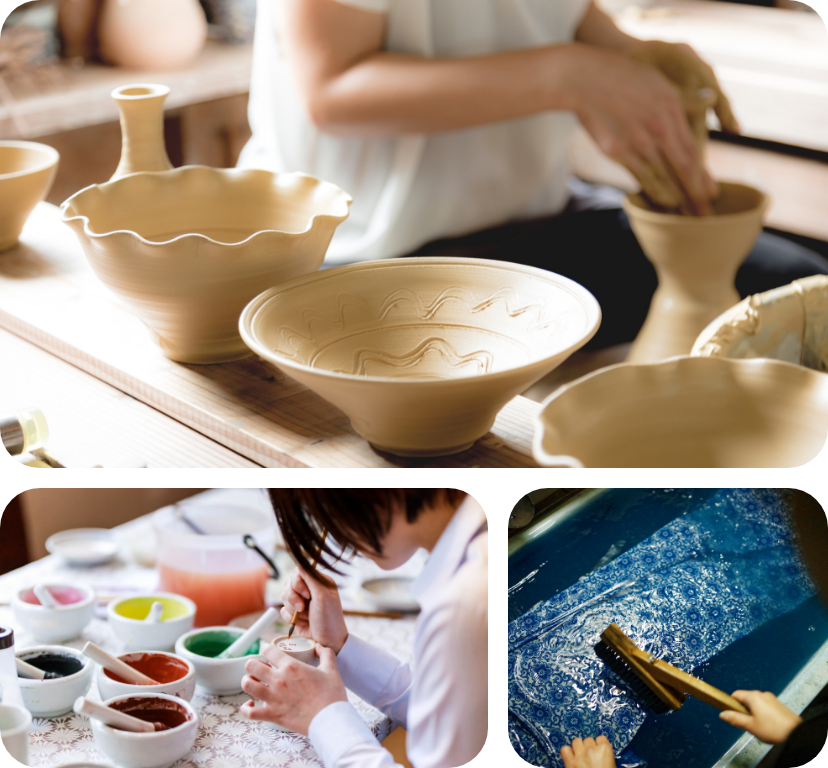 透過陶藝、彩繪、染色、金工銀飾、貼金箔等手作體驗,親身感受日本各地代代傳承的文化與工藝。參觀職人工作現場,親手製作,享受一段遠離日常的特別時光。這些在地限定的體驗,不論年齡,都將成為旅途中最珍貴的回憶。完成的作品約一個月後寄到府上,等待的日子也充滿了期待與悸動。無論是留作紀念,還是作為特別的禮物,都是最棒的選擇。