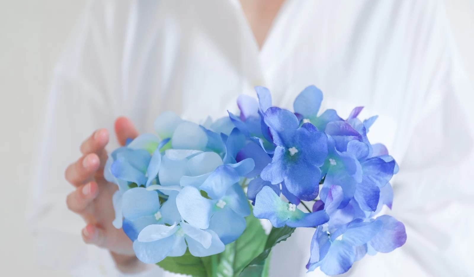藍色或紫色的紫陽花,花語是「堅忍而深沉的愛」。據說源自於它在梅雨長時間降雨中依然堅韌綻放的姿態,特別適合用來傳達含蓄內斂的氣質與深厚的情感。