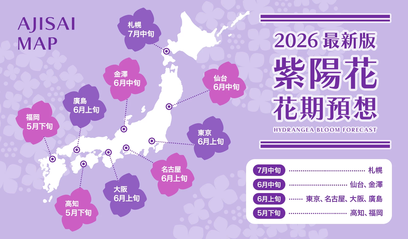 紫陽花的開花時間會隨著春季到初夏之間的氣溫,以及當年的氣候條件而有所變動。由於全國各地的最佳觀賞期因地區不同而有所差異,建議在出發前隨時查詢目的地的官方網站或最新觀測資訊,掌握即時花況。