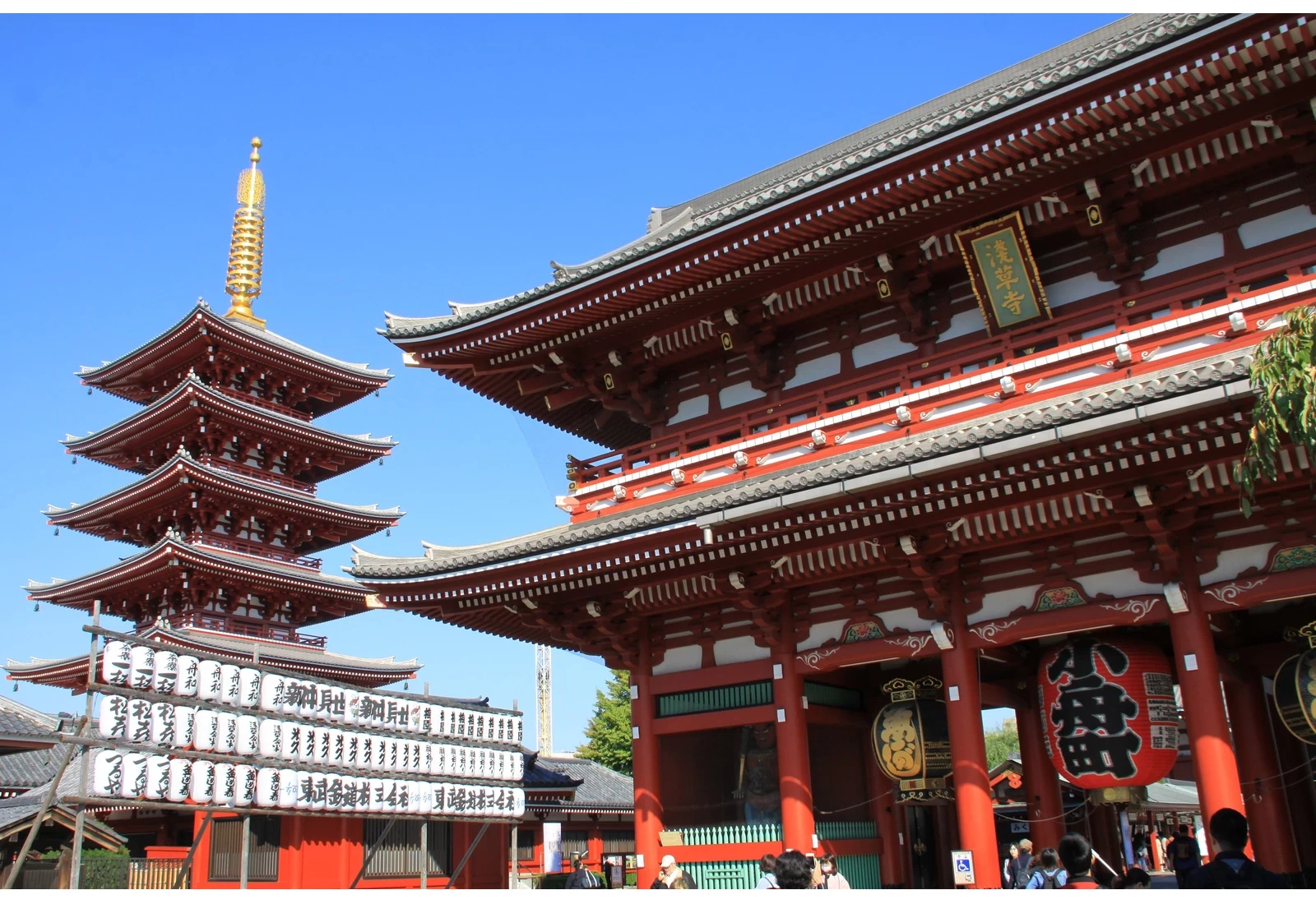 供奉聖觀世音菩薩的「淺草寺」,擁有約1400年悠久歷史,是東京屈指可數的古剎之一。寺內景點眾多,從懸掛著寫有「雷門」字樣巨大紅燈籠的山門,到供奉著保佑身體健康與避災除厄守護神的寶藏門,以及數度歷經災難後重建的莊嚴本堂,皆值得細細參觀。