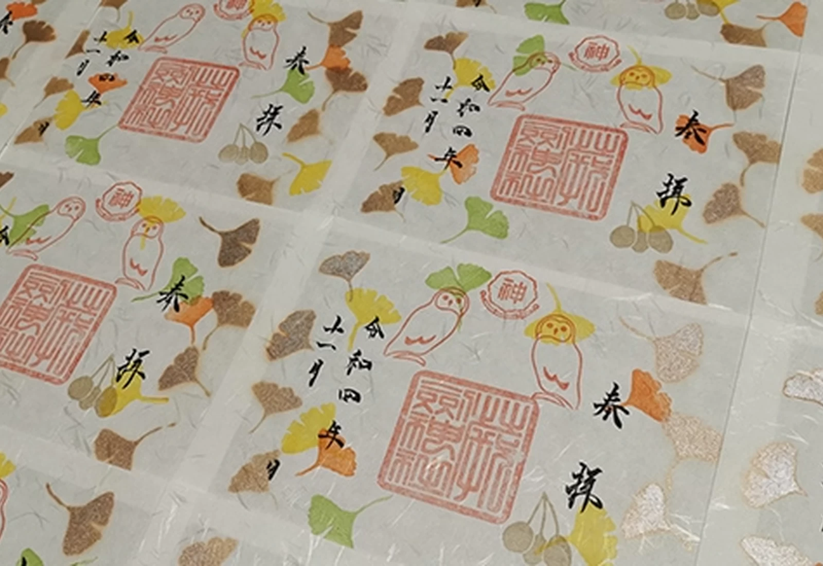 神社的神紋描繪的是象徵吉祥的成對貓頭鷹,寓意子孫綿延、家運興隆,以及良緣如扇面般不斷延展。季節限定的御朱印中也能見到貓頭鷹神紋的身影,將其迎回珍藏,同樣是參拜時令人期待的小樂趣之一。
