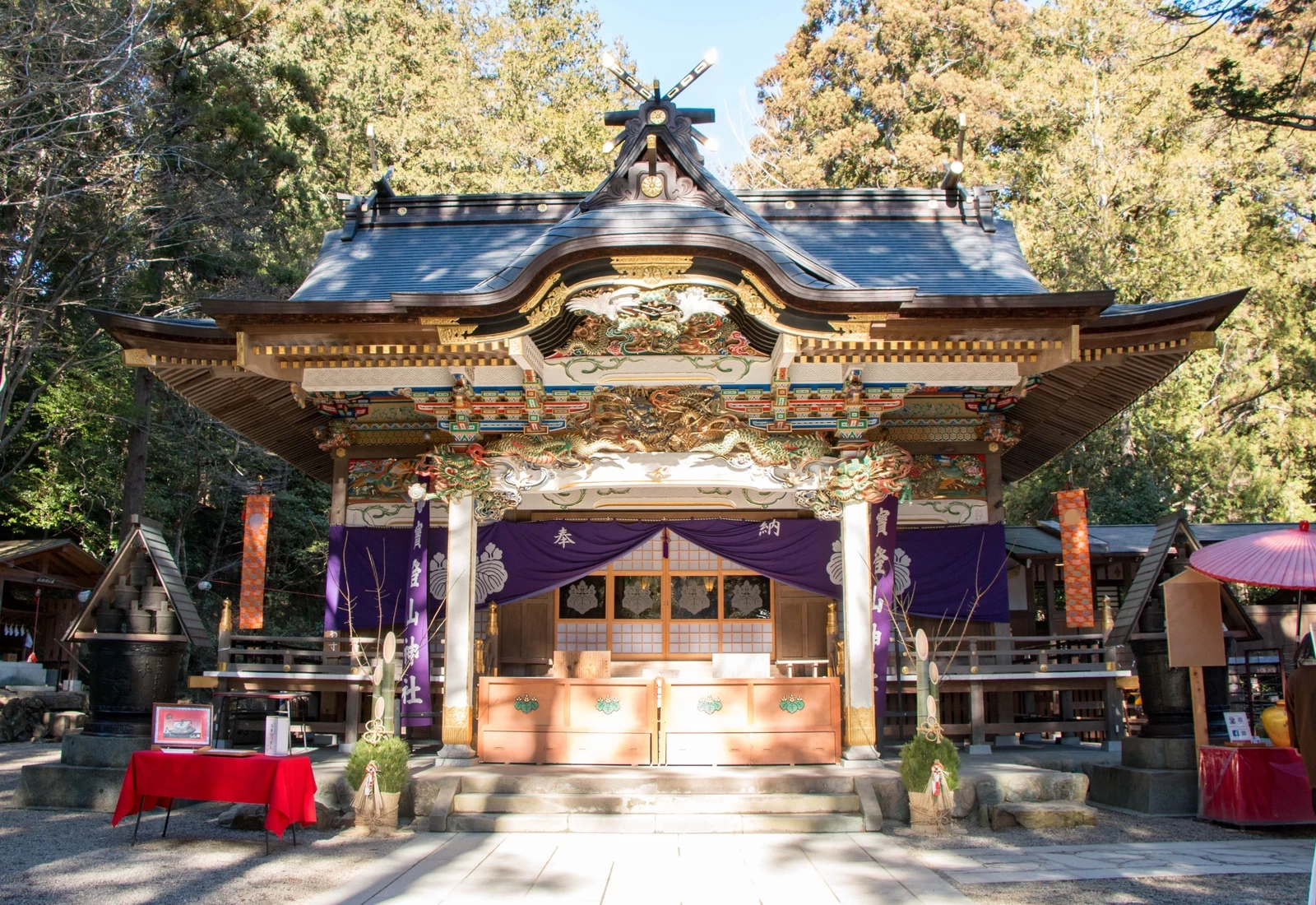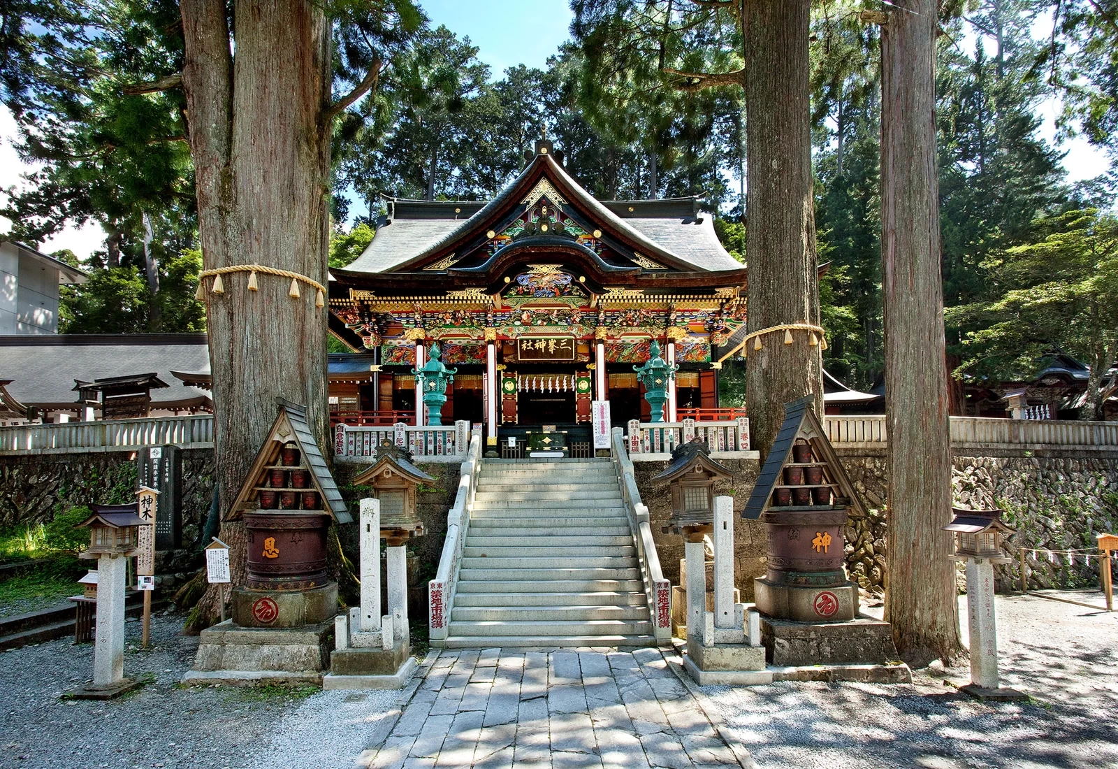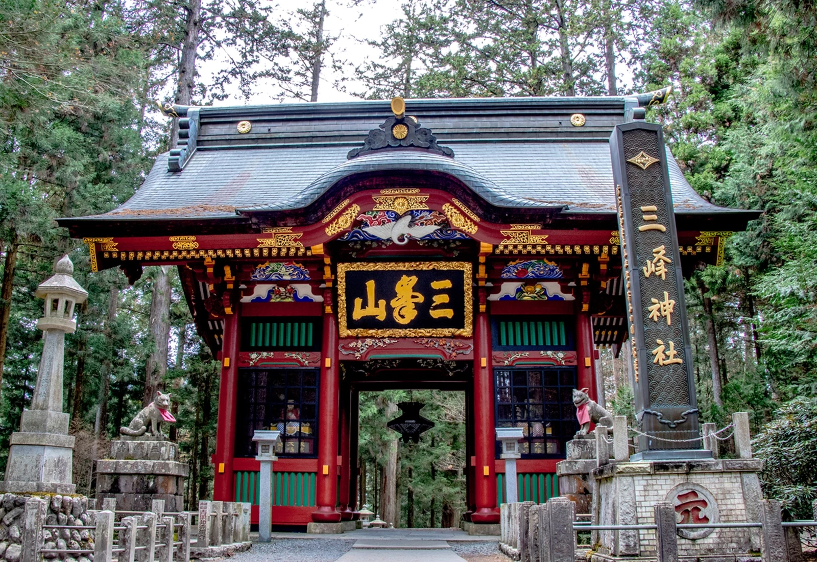 「三峯神社」相傳由日本武尊於約1900年前創建,被譽為關東地區規模數一數二的能量景點。參道入口處的「三重鳥居」是全國罕見的鳥居形式,左右並非狛犬,而是以狼作為守護神獸,展現出三峯神社獨特而神聖的氣息。